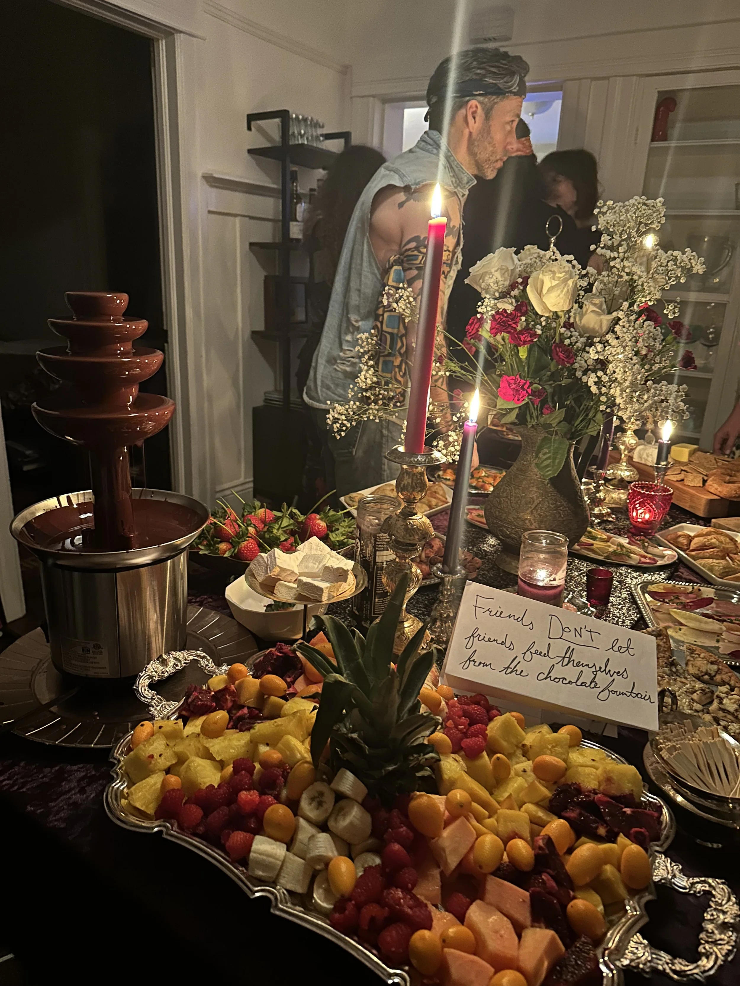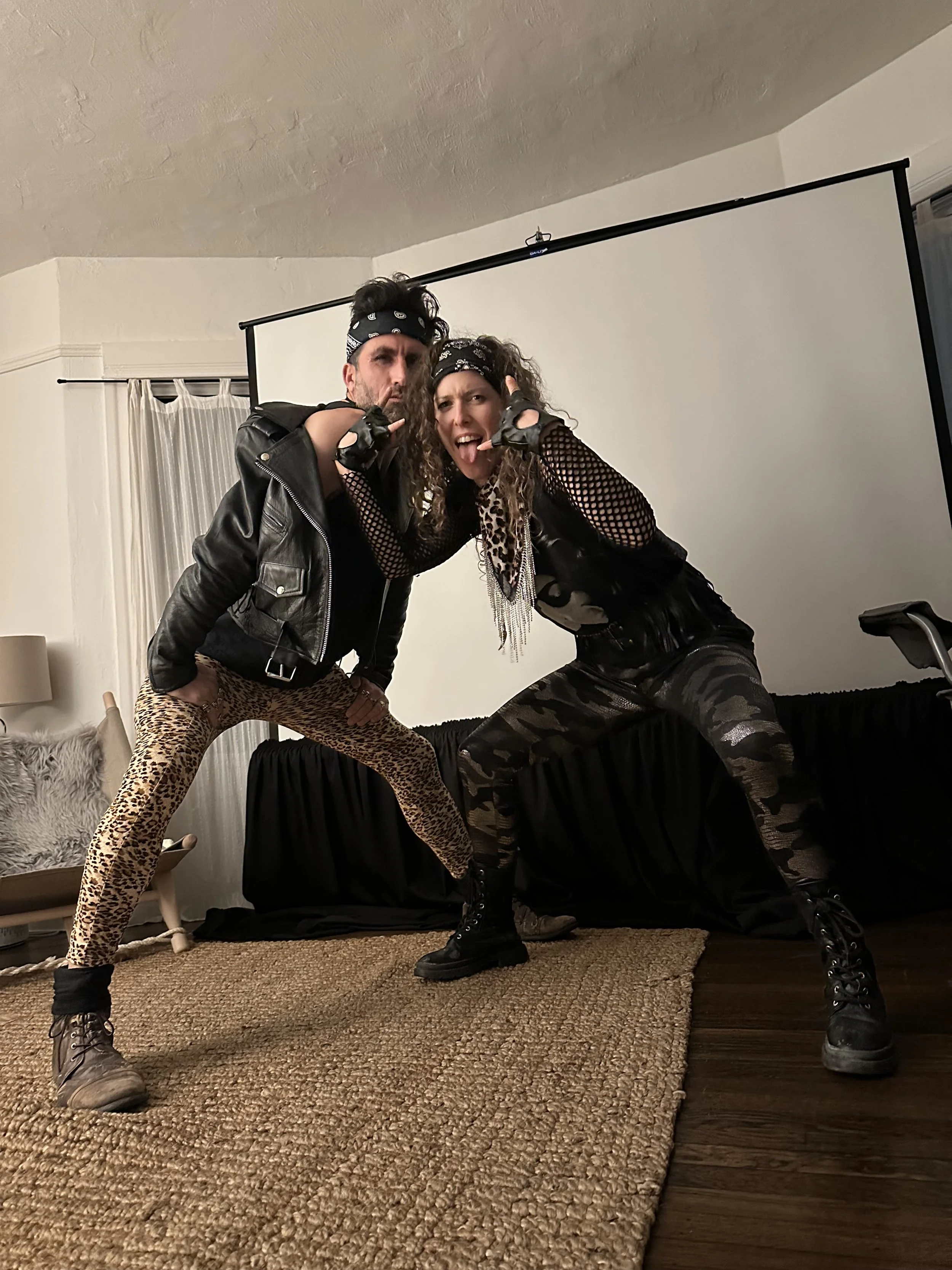A Valentine’s Day homage to 80’s excess, glam-rock melodrama, and the catharsis of belting power ballads to the rafters. Guests arrived to a feast worthy of a backstage rider — candles blazing, florals exploding, chocolate fountain flowing —then settled in for a raucous communal sing-along to the greatest hair band music videos ever uploaded to YouTube, projected on a massive screen, the night swelling to an arena-sized chorus of unapologetic, hairspray-scented joy.