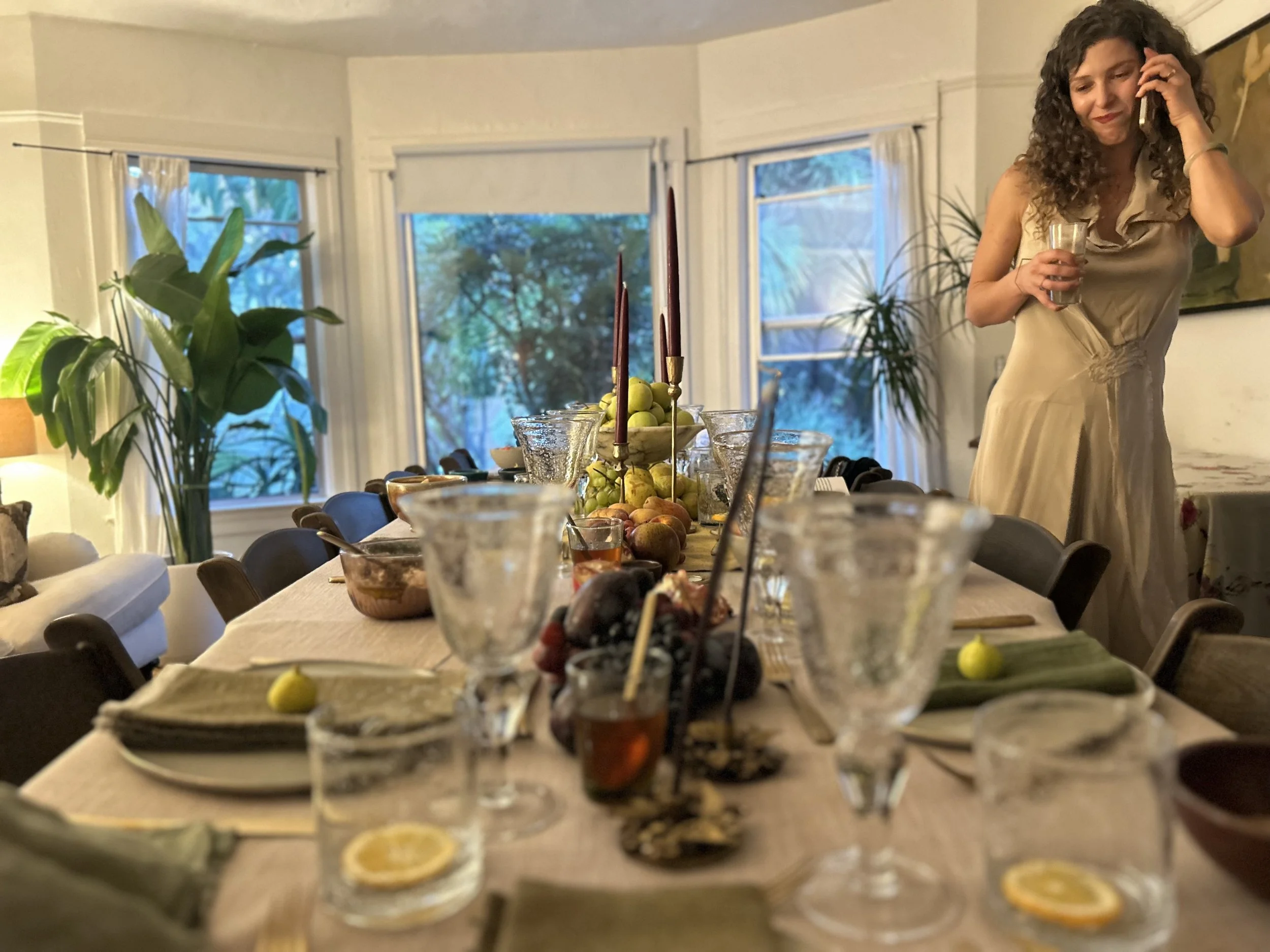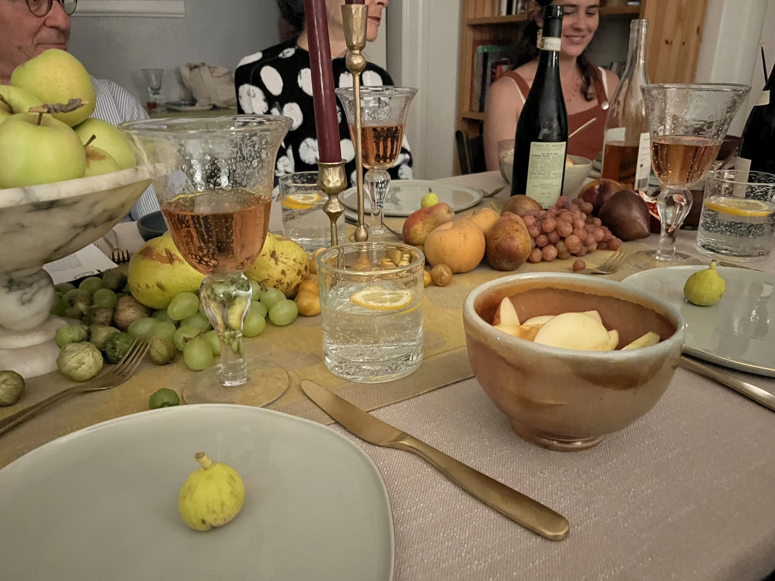 An evening of seduction-by-harvest: a Rosh Hashanah dinner celebrating the Jewish New Year for fourteen built around abundance, intimacy, and the slow pleasure of a shared meal. The tablescape drew inspiration from the lush ceramic garlands of the Italian Della Robbia tradition. Grapes, figs, pears, plums, ,and pomegranates ran down the center of the table, bringing to life the chiaroscuro drama of Caravaggio painting. Guests arrived to a progression of seasonal appetizers before settling into a family-style feast where candlelight, layered textures, and an edible centerpiece of overflowing fruit welcomed the new year with quiet opulence.